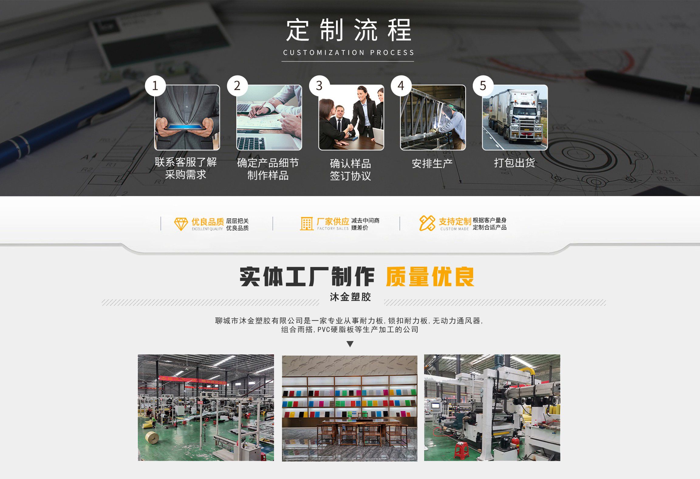 聊城市沐金塑膠有限公司注冊資金2180萬元,占地20000余平方,擁有自建廠房15000平方,員工100余名。10余年來,公司主營耐力板,鎖扣耐力板,耐力板深加工,無動力通風(fēng)器,組合雨搭,PVC硬脂板,耐力板廠家等板材的發(fā)展戰(zhàn)略,逐漸成長為綜合性企業(yè)?! 」緭碛卸鄺l板材共擠生產(chǎn)線,采用世界知名品牌進(jìn)口原材料和先進(jìn)工藝,依據(jù)完善的ISO9001質(zhì)量管理體系和ISO14001環(huán)境管理體系,為產(chǎn)品的卓越品質(zhì)提供了強(qiáng)有力的保證。憑借過硬的創(chuàng)新能力和堅(jiān)實(shí)的硬件基礎(chǔ),贏創(chuàng)已成為國內(nèi)領(lǐng)先的熱塑性板材生產(chǎn)商,產(chǎn)品被廣泛應(yīng)用于建筑業(yè)、農(nóng)業(yè)、工業(yè)、廣告業(yè)、安防行業(yè)及DIY領(lǐng)域?! 」臼冀K致力于通過提供最優(yōu)的板材應(yīng)用解決方案,為客戶創(chuàng)造最高的價(jià)值;堅(jiān)守創(chuàng)新、質(zhì)量、靈活、服務(wù)和速度的核心價(jià)值觀;堅(jiān)持“完美的產(chǎn)品需要完美服務(wù)的支持”的經(jīng)營理念,努力實(shí)現(xiàn)成為世界領(lǐng)先的板材與解決方案供應(yīng)商的夢想?! ≡谖磥恚緦⒘⒆憧蛻粜枨?,不斷改變和完善現(xiàn)有產(chǎn)品,拓展產(chǎn)品線和充分開發(fā)板材的應(yīng)用領(lǐng)域,為客戶創(chuàng)造全方位的價(jià)值。同時(shí)更好地實(shí)現(xiàn)員工的價(jià)值,實(shí)現(xiàn)公司團(tuán)隊(duì)的價(jià)值。我們將與您一起創(chuàng)贏未來! 企業(yè)使命:成為世界領(lǐng)先的板材與解決方案供應(yīng)商。 公司愿景:通過提供最優(yōu)的板材應(yīng)用解決方案,為客戶創(chuàng)造最高的價(jià)值?! 『诵膬r(jià)值觀:質(zhì)量...