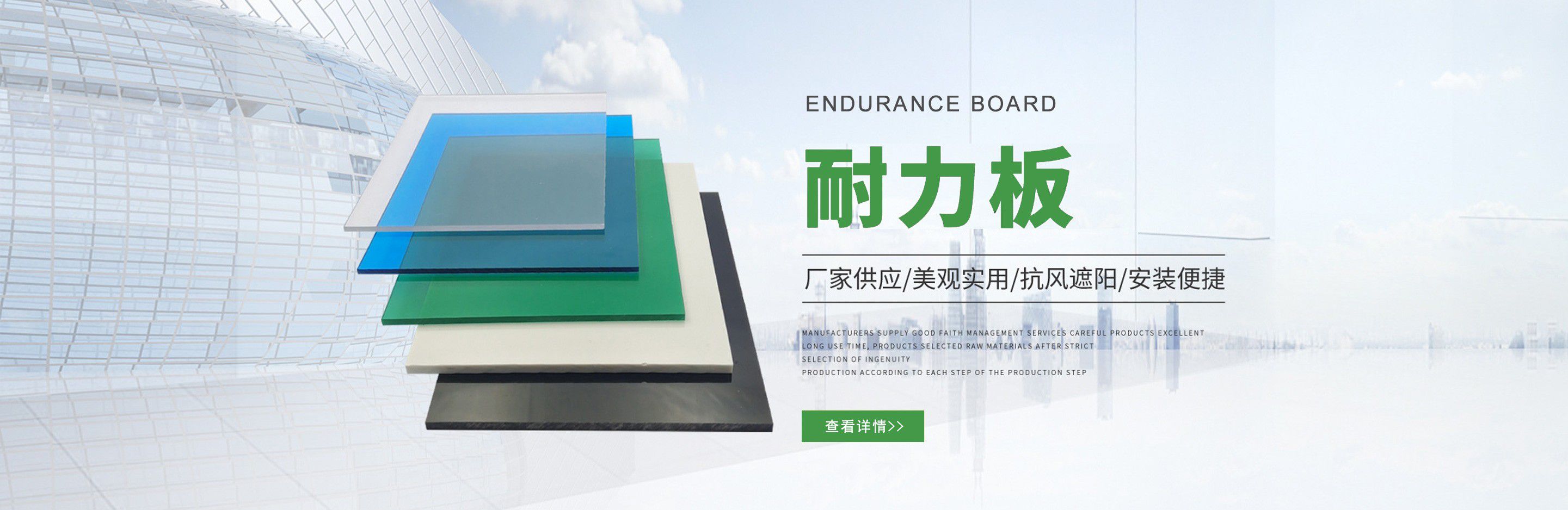 聊城市沐金塑膠有限公司注冊資金2180萬元,占地20000余平方,擁有自建廠房15000平方,員工100余名。10余年來,公司主營耐力板,鎖扣耐力板,耐力板深加工,無動力通風(fēng)器,組合雨搭,PVC硬脂板,耐力板廠家等板材的發(fā)展戰(zhàn)略,逐漸成長為綜合性企業(yè)?! 」緭碛卸鄺l板材共擠生產(chǎn)線,采用世界知名品牌進(jìn)口原材料和先進(jìn)工藝,依據(jù)完善的ISO9001質(zhì)量管理體系和ISO14001環(huán)境管理體系,為產(chǎn)品的卓越品質(zhì)提供了強(qiáng)有力的保證。憑借過硬的創(chuàng)新能力和堅(jiān)實(shí)的硬件基礎(chǔ),贏創(chuàng)已成為國內(nèi)領(lǐng)先的熱塑性板材生產(chǎn)商,產(chǎn)品被廣泛應(yīng)用于建筑業(yè)、農(nóng)業(yè)、工業(yè)、廣告業(yè)、安防行業(yè)及DIY領(lǐng)域?! 」臼冀K致力于通過提供最優(yōu)的板材應(yīng)用解決方案,為客戶創(chuàng)造最高的價(jià)值;堅(jiān)守創(chuàng)新、質(zhì)量、靈活、服務(wù)和速度的核心價(jià)值觀;堅(jiān)持“完美的產(chǎn)品需要完美服務(wù)的支持”的經(jīng)營理念,努力實(shí)現(xiàn)成為世界領(lǐng)先的板材與解決方案供應(yīng)商的夢想?! ≡谖磥恚緦⒘⒆憧蛻粜枨?,不斷改變和完善現(xiàn)有產(chǎn)品,拓展產(chǎn)品線和充分開發(fā)板材的應(yīng)用領(lǐng)域,為客戶創(chuàng)造全方位的價(jià)值。同時(shí)更好地實(shí)現(xiàn)員工的價(jià)值,實(shí)現(xiàn)公司團(tuán)隊(duì)的價(jià)值。我們將與您一起創(chuàng)贏未來! 企業(yè)使命:成為世界領(lǐng)先的板材與解決方案供應(yīng)商。 公司愿景:通過提供最優(yōu)的板材應(yīng)用解決方案,為客戶創(chuàng)造最高的價(jià)值?! 『诵膬r(jià)值觀:質(zhì)量...